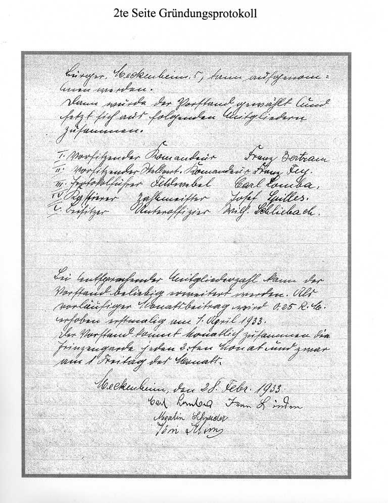 Gründungsprotokoll der Prinzengarde Meckenheim vom 28.02.1933.